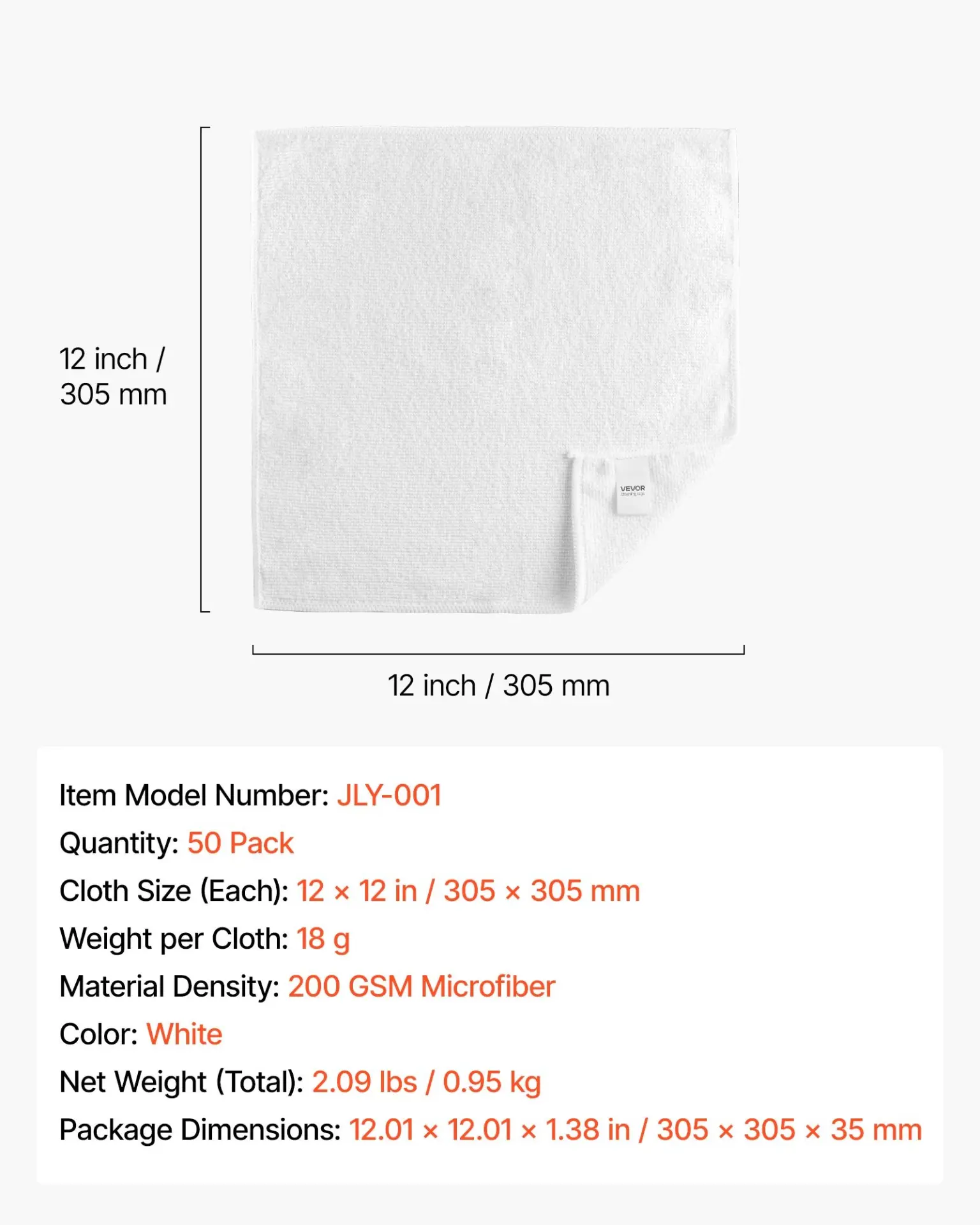 Package Dimensions: 12.01 x 12.01 x 1.38 in / 305 x 305 x 35 mm,Cloth Size (Each): 12 x 12 in / 305 x 305 mm,Material Density: 200 GSM Microfiber,Weight per Cloth: 18 g,Color: White,Net Weight (Total): 2.09 lbs / 0.95 kg,Item Model Number: JLY-001,Quantity: 50 Pack